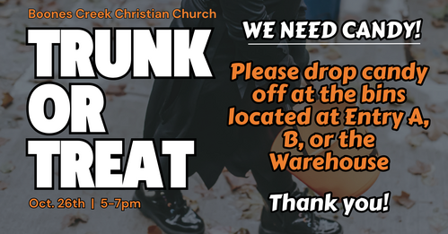 With Trunk or Treat approaching on Sunday, October 26th - we would greatly appreciate candy donations! You can drop candy off at the bins located at Entry A, B, or at the Warehouse!