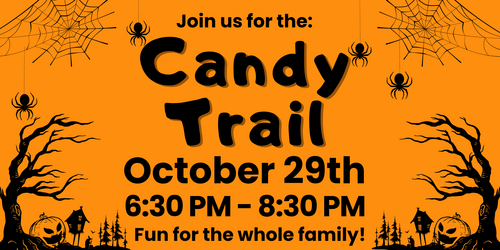 Join us on October 29th from 6:30-8:30 at the Candy Trail at the Boones Creek Union Campus. We would love to have your entire family join us and walk the trail for fun and of course CANDY! We are also needing volunteers to decorate a "candy station" along the trail and pass out candy to the kids that come. If you are able to help, please just let Justin know you can help by texting "Trail" to 423-251-1200, or click the button below. You can also drop candy off at the office during the week or bring it out to Union. Thank you for your help!