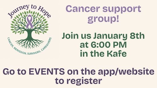 Journey to Hope is a positive monthly group support for those with cancer, in remission, survivors, and caregivers. The group will meet on January 8th at 6:00 PM in the Koinonia Kafe for a light supper and look at renewal. What can we renew in our lives? Psalm 51:10 - "Create in me a pure heart, O God, and renew a steadfast spirit within me." Please click the button below to register by January 5th.